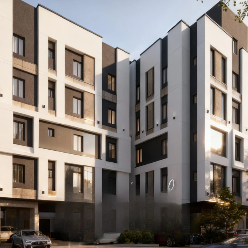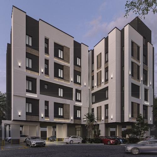 تتميز الواجهة بتصميمها المعماري العصري، تتوزع النوافذ بشكل متناسق عبر الواجهة، وتزينها إضاءة خارجية، مما يضفي جمالية وإضاءة مميزة، مع لمسات من البلاطات والخرسانة الظاهرة التي تعزز من المظهر العصري، الطابق الأرضي مخصص لمواقف السيارات، مع وجود مساحات خضراء ونباتات عند المدخل الرئيسي تضيف لمسة من الطبيعة إلى البيئة الحضرية